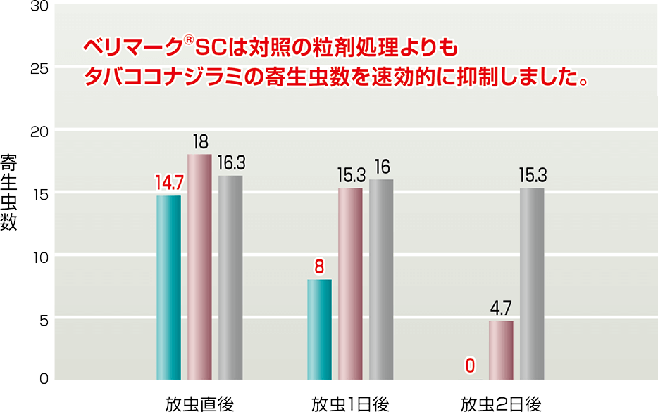 【試験概要】◎品種:りんか409◎区制:1区 10株 3連制◎対象病害虫発生状況:中→多発生(放虫)◎播種:4月9日◎定植:5月24日◎処理日:5月24日(A粒剤は5月21日)◎処理方法:ベリマーク®SCは400株当り原液25㎖処理とするため、各株の株元に8000倍に希釈した薬液500㎖を根回し水灌注処理した。定植3日前に、A粒剤は所定量を育苗ポットに処理した。◎処理時の作物のステージ:草丈40~50cm、本葉約8枚◎調査日:定植7日後(5月31日)、定植14日後(6月7日)、定植21日後(6月14日)、定植28日後(6月21日)◎調査方法:各区6株について、上、中、下位から1複葉(3複葉/ 株、合計18複葉)を選び、寄生する成虫および幼虫(中齢、老齢)を肉眼により計数した。