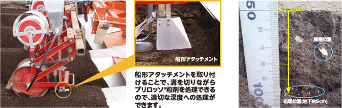 ® 粒剤の有効成分は、接触よりも経口の方が活性が高いことが判っています。よって、だいこんの根圏がある場所に薬剤を処理することにより、有効成分が植物体に吸収され、さらに安定した効果を発揮させることができます。播種溝土壌混和処理の適用登録ですが、播種同時処理機械や簡易播種機を使用される場合は、その点を考慮されたほうが効果が安定します。薬剤の処理深度は目安として3~6cmですが、手動播種機ではその深度に処理するのは困難なので、できるだけ種子と同レベルの深度を目指してください。
