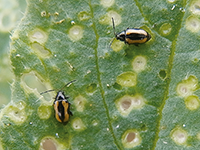 | キスジノミハムシによる被害 | 根を食害するキスジノミハムシ幼虫 | 葉を食害するキスジノミハムシ成虫 |