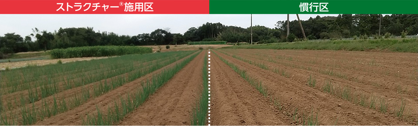 茨城県生産者様定植時より極度の乾燥にみまわれた。灌水を2度ほどしたものの、約1ヶ月以上も降雨がなく略々あきらめていた。ところが、ストラクチャー®処理区はうまく活着、生育する結果となった。