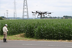 実証試験2年目の2023年より、プレバソン®フロアブル5のドローン散布がはじまった「登録を受けて、飼料用トウモロコシ(子実)の雄穂抽出前の7月に、実証試験圃場106haにプレバソン®フロアブル5を20倍希釈、10aあたり1ℓの使用液量でドローン散布を行いました」。