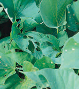 主に幼虫がサツマイモの葉を加害します。若齢幼虫は葉に点々と穴をあけて食害しますが、中~老齢幼虫では太い葉脈を残して葉を食い尽くすようになります。少しの被害であれば、影響は少ないですが、多発して葉が食い尽くされるとサツマイモの収量そのものが低下してしまいます。